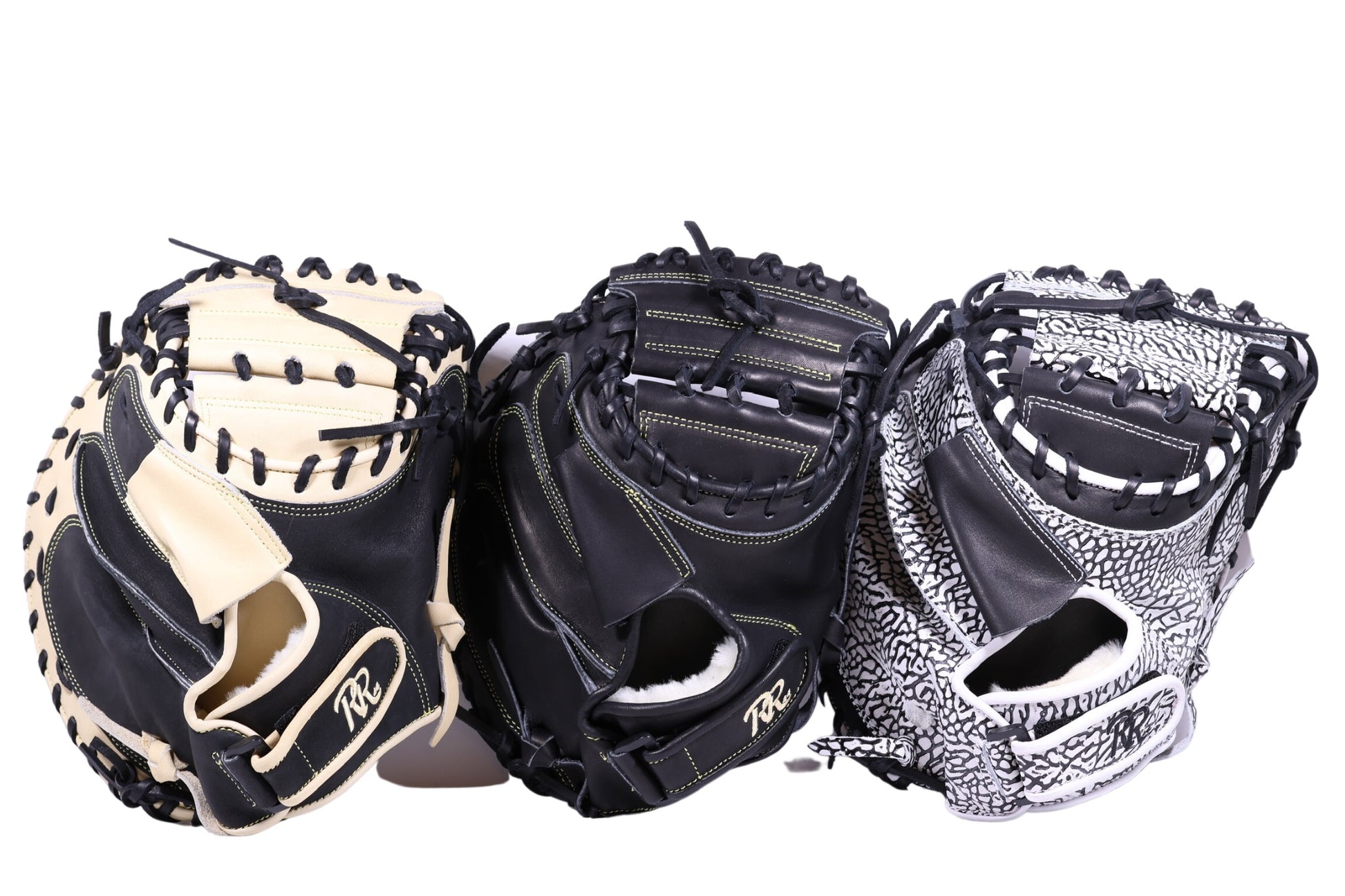 RR44 Catcher gloves 3 options to select: Black & tan, Tan & Black and Elephant skin. All choices are Full-American kip leather design for Youth, High School, College and Professional players. Good quality gloves for a good affordable prices.